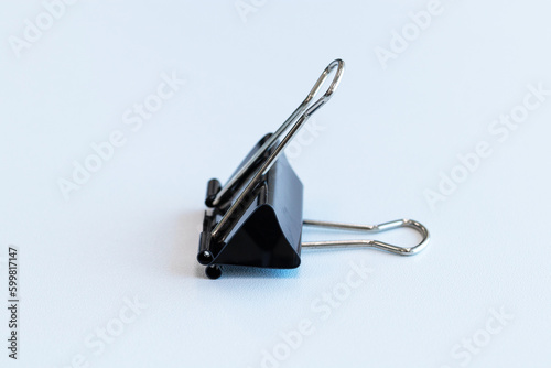 Side picture Metal Black Paper clip big on white background. Office equipment, school equipment. Most paper clips are metal wire. May be coated or uncoated. clamping multiple sheets of paper together.