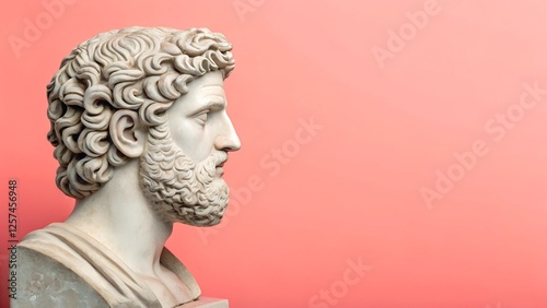 Side profile of a detailed Greek marble bust with curly hair, presented against a soft coral gradient background. The classic sculpture stands out beautifully with copy space for customization.