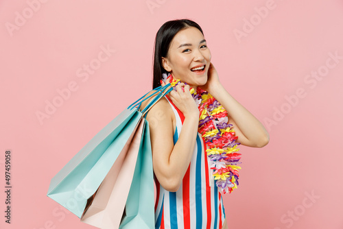 Side view fun young woman of Asian ethnicity in striped swimsuit hawaii lei hold package bags with purchases after shopping isolated on plain pastel pink background. Summer vacation sea rest concept.