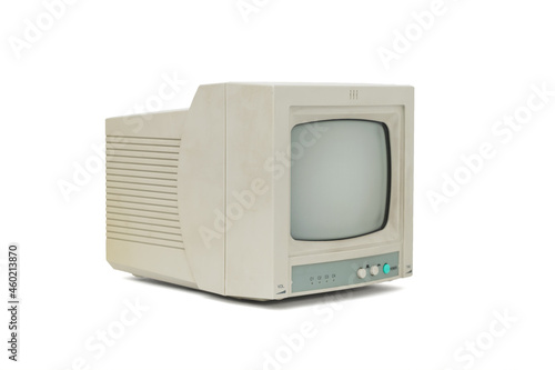 Side view of a gray retro monitor isolated on a white background.
