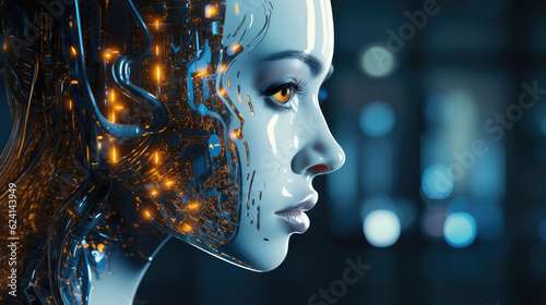 half face, android, blue, yellow, vibrant, neon, futuristic, technology, artificial intelligence, closeup, innovation, robotic, digital, cyborg, electronic, advanced, modern, science fiction, machine, high technology, metal, circuit, concept, science, intelligent, futurism, mechanism, tech, cybernetic, android, ai, closeup, mechanical, visionary, circuitry