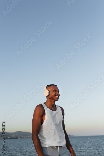 man, runner, smiling, warm up, training, earphones, stretch, energy, happy, condensed, well-being, male, wireless, music, wellness, exercise, fit, jogger, activity, black, athlete, contraption, device, listen, healthy, sound, melody, slim, sportsman, motivation, cardio, audio, activewear, african american, fitness, shape, practice, embankment, physical, muscular, strength, seafront, activewear, prepare, strong, action, stamina, active, half face, content