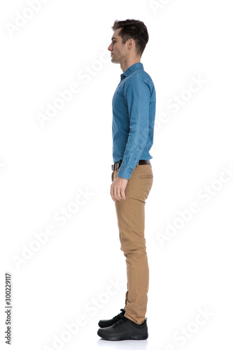side view of smart casual man waiting in line