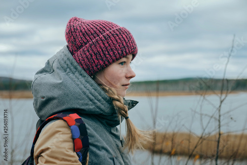 girl, teenage, teenage, caucasian, racked, side, look, plant, river, water, lifestyle, travel, vacation, nature, warm clothes, backpack, blond, braid, long hair, sky, outdoors, day, alone, 1, people
