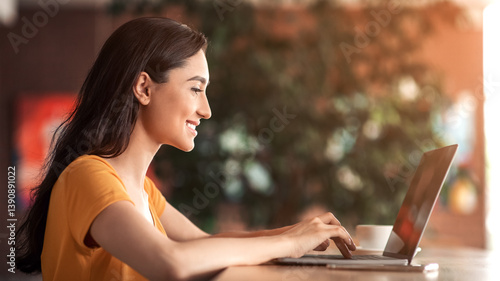 Side view of typing on laptop arab girl, surfing on internet, resting at cafe, free space