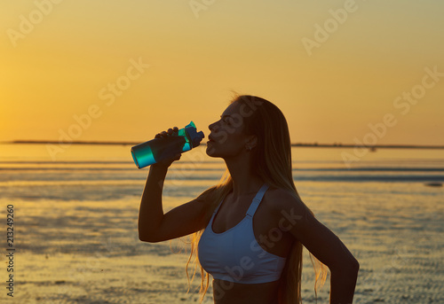 active, background, beach, beautiful, beauty, bottle, coast, drinking, exercise, female, fitness, girl, happy, health, healthy, lifestyle, nature, ocean, people, person, sea, sky, sport, summer, sunset, tropical, vacation, warrior, water, woman, physical exercise, silhouette