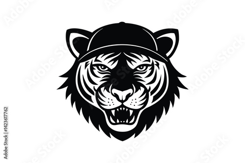 Silhouette art illustration of a tiger head wearing baseball cap and chain.eps