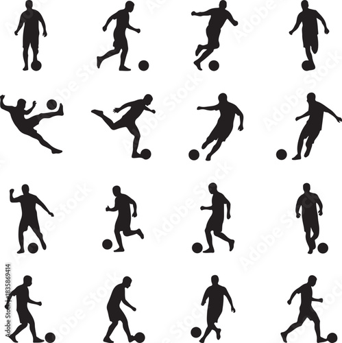 Silhouette collection depicting various dynamic soccer players in action poses
