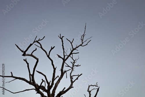 Silhouette death branches of tree with tiny moon on evening sky before dark