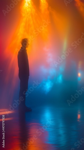 silhouette, figure, person, light, colourful, vibrant, diffused, fog, neon, abstract, art, contemporary, modern, painting, photo, blurred, texture, atmosphere, mood, lighting, design, visual, effect, water, floor, standing, still, orange, red, blue, cyan, yellow, warm, cool, artist, installation, exhibition, gallery, space, imagination, mystery, fantasy, dreamlike, light painting