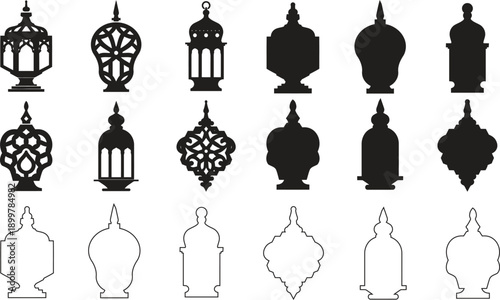 Silhouette Islamic Lanterns with Patterns Icons Set. Decoration, Ramadan, Light Vector Illustration