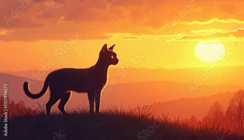 cat, silhouette, sunset, hill, golden hour, outdoors, nature, peaceful, serene, glowing, charming, vibrant, calm, countryside, scenic, warm light, harmony, beautiful, idylli, tranquil, natural, majestic, elegant, picturesque, evening, orange sky, wild, relaxing, rural, atmospheric, solitude, relaxed, contemplative, timeless