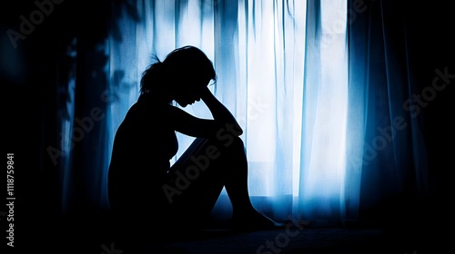 Silhouette of a depressed woman sitting on the floor in a bedroom