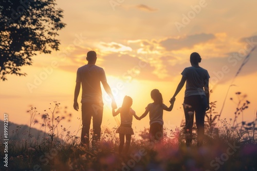 Silhouette of a family holding hands at sunset, mother, father, children, outdoor happiness, blurred nature background