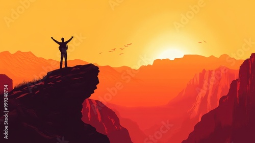 Silhouette of a hiker standing triumphantly at the mountain summit, overlooking cliffs and valleys with a breathtaking view of nature.