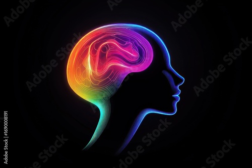 Silhouette of a human head with a vibrant, colorful brain outline glowing in neon lines representing neural activity and cognitive functions