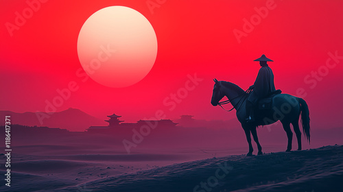 Silhouette of a lone horse rider in traditional attire gazing at a vibrant red sunset over distant Asian temples