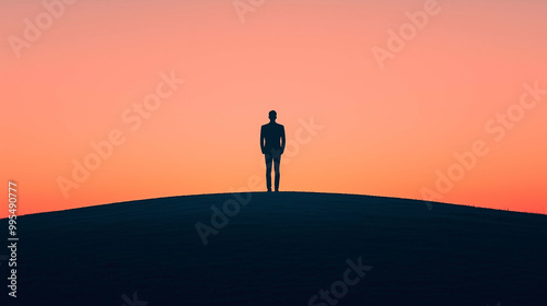 Silhouette of a Lone Man Standing on a Hilltop as the Sun Sets Beyond the Horizon