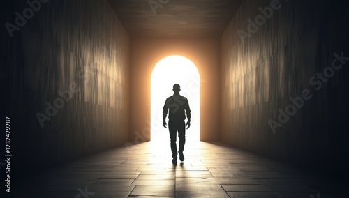 light, tunnel, hope, silhouette, man, journey, future, transformation, bright, perseverance, progress, renewal, darkness, contrast, inspiration, minimalist, pathway, glow, change, resilience, success, optimism, symbolic, uplifting, achievement, life, positive, atmosphere, freedom, new, faith, determination, walking, motivation, calm, peace, spiritual, serenity, dream, purpose, way, perspective, emotion, clarity, movement, direction, breakthrough, goal
