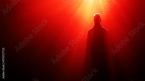 man, silhouette, red, light, dark, background, spotlight, shadow, mystery, person, human, figure, alone, standing, back, mysterious, dramatic, intense, power, energy, hope, faith, fear, danger, warning, concept, abstract, art, design, illustration, graphic, image, photo, picture, texture, mood, atmosphere, environment, scene, setting, red light, ray, glow, bright