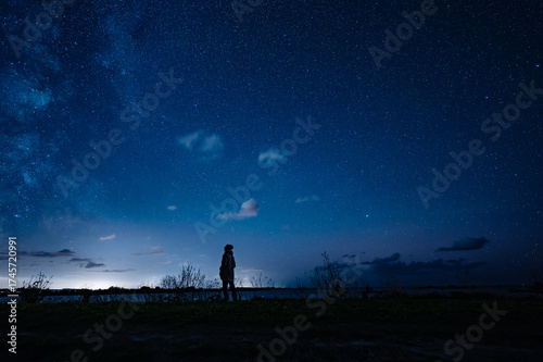 Silhouette of a man looking up at a clear starry night sky with the Milky Way, symbolizing wonder, solitude, and connection with the universe.
