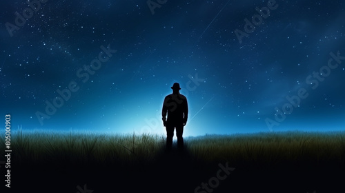 Silhouette of a man on the street against the backdrop of bright stars in the sky.