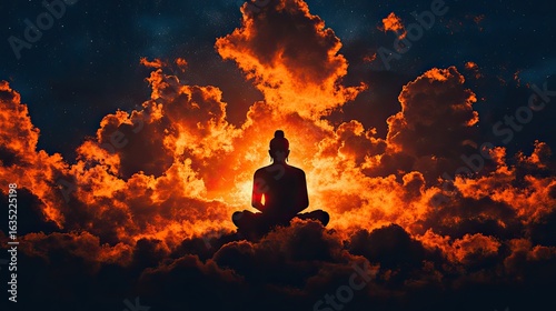Silhouette of a meditating person amidst fiery clouds against a starry sky background