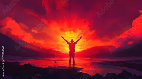 silhouette, person, arm, raised, sky, sunset, vibrant, hue, orange, pink, scene, symbolic, prayer, connection, spiritual, devotion, nature, horizon, freedom, outdoors, peace, serenity, hope, emotion, meditation, gratitude, evening, light, inspiration