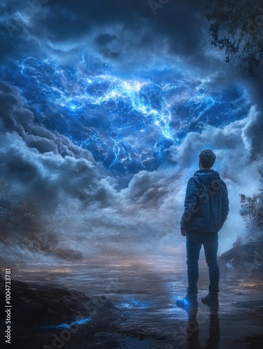 silhouette, person, night sky, lightning, dramatic, surreal, sky, cloud, stormy, moody, nature, outdoors, light, atmospheric, mysterious, horizon, scenic, landscape, standing, backview, dramatic sky, blue, awe, staring, nature scene, man, contemplation, storm, electric, nightscape, weather, abstract, fantasy, blue light, aethereal, futuristic