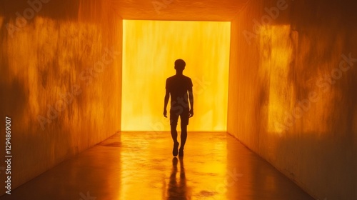 silhouette, person, walking, tunnel, orange, yellow, light, warm, bright, path, future, mystery, shadow, figure, human, journey, glowing, abstract, surreal, hope, ambitious, dark, dramatic, cinematic, atmospheric, enigmatic, powerful, movement, direction, destination, progress, inner, strength, determination, vision, perspective, gold, illuminated, hallway, passage, futuristic, digital, art, concept, design, graphic