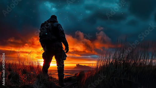 sunset, silhouette, soldier, sky, cloud, orange, dramatic, landscape, grass, horizon, dusk, twilight, nature, outdoors, peaceful, contemplation, solitude, evening, scenic, view, tranquil, shadow, adventure, dark, glowing, mystery, colourful, exploration, backpack, traveler, wilderness, serene, moody, atmosphere, journey