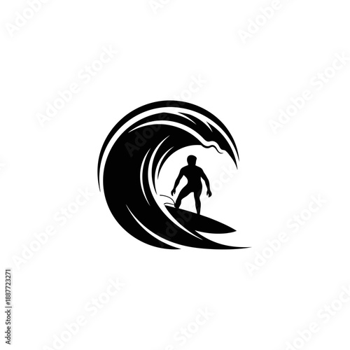 surfer, wave, ocean, sea, surfing, sport, logotype, silhouette, black, white, design, graphic, symbol, icon, surfboard, rider, action, movement, dynamic, stylised, simple, minimalist, vector, illustration, art, water, blue, freedom, adventure, leisure, recreation, fun, thrill, excitement, energy, youth, lifestyle, beach, coast, shore, tropical, paradise, summer, vacation, holiday, escape, relaxation, serenity, peace