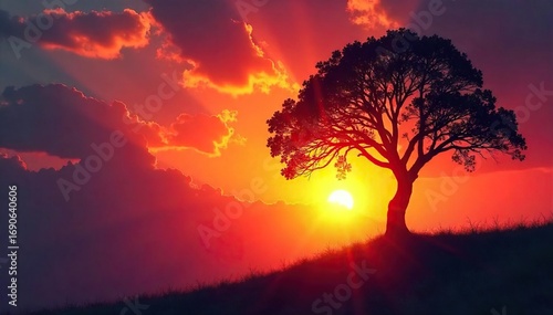 Silhouette of a tree reaching towards a vibrant sunrise, symbolizing upward growth and spiritual awakening A powerful image of hope, aspiration, and inner peace , enlightenment, mindfulness