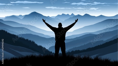 Silhouette of a victorious man standing on a mountain peak with arms raised, symbolizing success, achievement, leadership, and personal growth in a business and motivational concept.