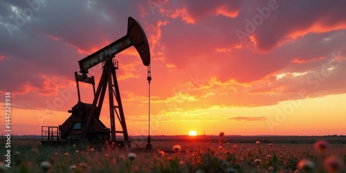 Silhouette of an oil derrick at sunset, standing tall amidst a field of wildflowers, bathed in warm golden and reddish hues, reflecting the fiery beauty of the twilight sky.