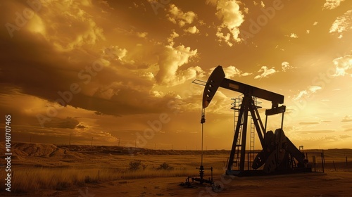 pump, jack, oil, rig, sunset, sky, cloud, horizon, field, grass, dry, brown, yellow, orange, silhouette, dusk, evening, landscape, gold, rural, energy, industry, extraction, production, machinery, equipment, metal, structure, ground, post, fence, wire, power, line, hill, distant, nature, cloudscape, twilight