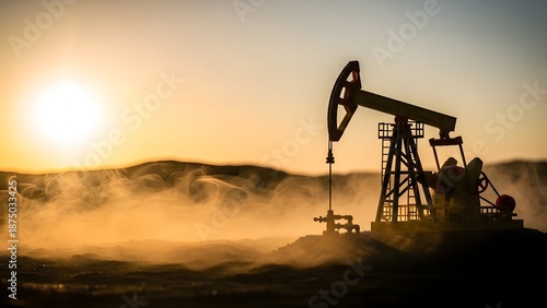 well, crude oil, condition, jack, rig, silhouette, drilling, pump, form, contrast, haze, heat, machinery, atmosphere, energy, oil, barren, shape, dust, vibrant, remote, daytime, desert, ecosystem, sun, terrain, extraction, industrial, climate, clear, scene, orange, geology, weather, sunset, black, dark, sky, cloudless, sand, rocky, yellow, equipment, area, nature, environment, landscape, dry, view