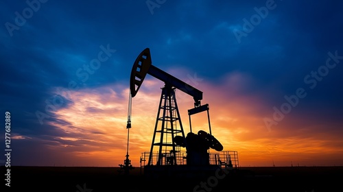 Silhouette of an oil pumpjack against a vibrant twilight sky, symbolizing energy production and the oil industry. Perfect for energy or environmental content