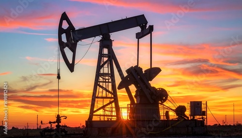 Silhouette of an oil pumpjack with a vibrant, colorful sunrise/sunset backdrop