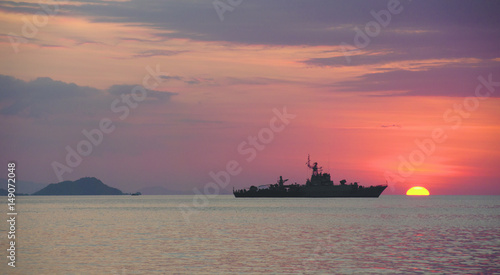 Silhouette of big ship on the ocean at nightfall with orange sunset at the background combined with a cloudy sky, Labuan Bajo, Bajawa.