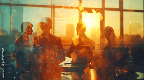 Silhouette of business people collaborating in an office environment, symbolizing teamwork and partnership. The image is enhanced with double exposure and light effects to convey a dynamic