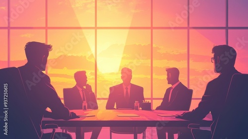Silhouette of business professionals in a meeting, featuring a stunning sunset backdrop, symbolizing collaboration and strategy.