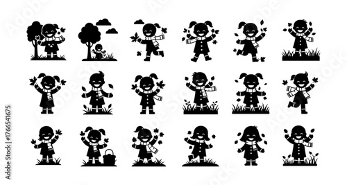 children, autumn, leaf, play, nature, silhouette, fun, happy, seasonal, black, white, tree, park, foulard, falling, cheerful, coat, girl, boy, landscape, leaf, grass, activity, playful, joyful, happiness, childhood, cute, smile, whimsical, illustration, simple, design, minimal, emotion, bonding