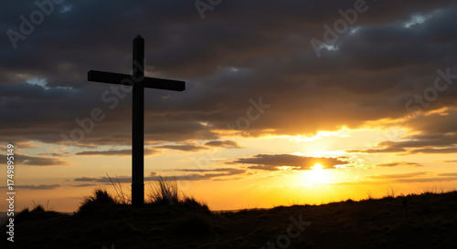 Silhouette of Christian cross on hill at sunset. Dramatic sky with golden light representing faith and hope. Religious and spiritual concept