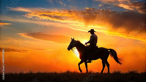 cowboy, horse, sunset, silhouette, western, rider, equestrian, outdoors, rural, evening, dusk, adventure, dramatic sky, gallop, cowboy hat, plain, horizon, majestic, wild west, landscape, twilight, equestrianism, man, countryside