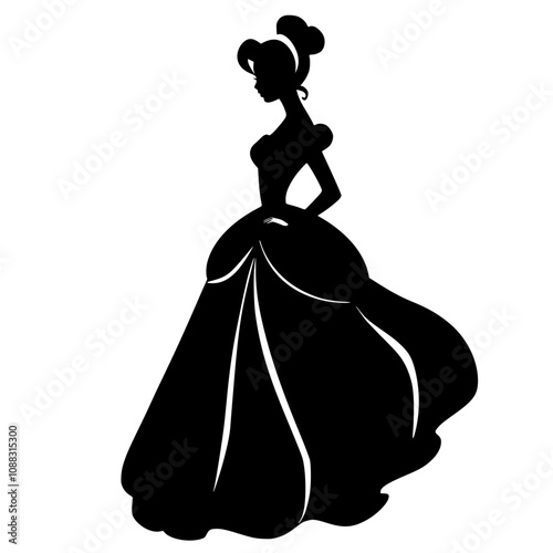 Silhouette of Elegant Woman in Ball Gown, Stylish black silhouette of a woman in a flowing ball gown, embodying elegance and grace, ideal for fashion and design themes.
