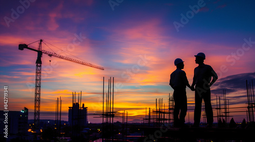Silhouette of Engineer and worker on building site, construction site at sunset in evening time