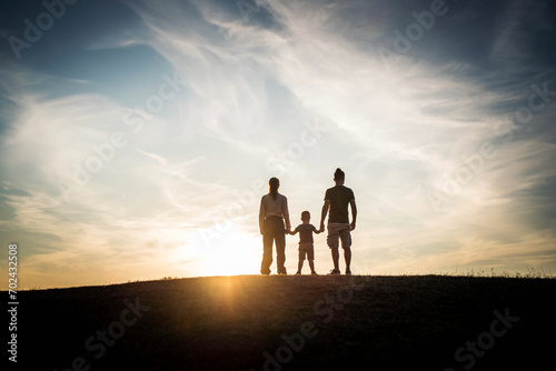 Silhouette of happy family watching the sunset together - Mother, father and child son having fun outdoors enjoying family time - Family, love, mental health and happy lifestyle concept