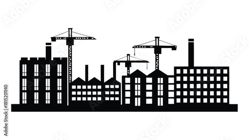 silhouette, industrial, building, crane, white, sky, factory, construction, architecture, city landscape, urban, industry, structure, tower, site, development, engineering, equipment, machinery, black, design, illustration, graphic, vector, art, drawing, artwork, shape, outline, symbol, icon, background, modern, abstract, minimalist, simple, monochrome, geometric, line, pattern