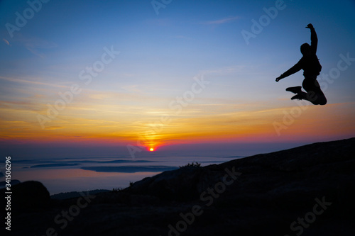 silhouette, sunset, jump, sky, woman, sun, sunrise, people, happy, joy, sport, freedom, running, person, mountain, success, fun, nature, jumping, runner, happiness, summer, fitness, active, orange, blue, acadia, national park, athlete